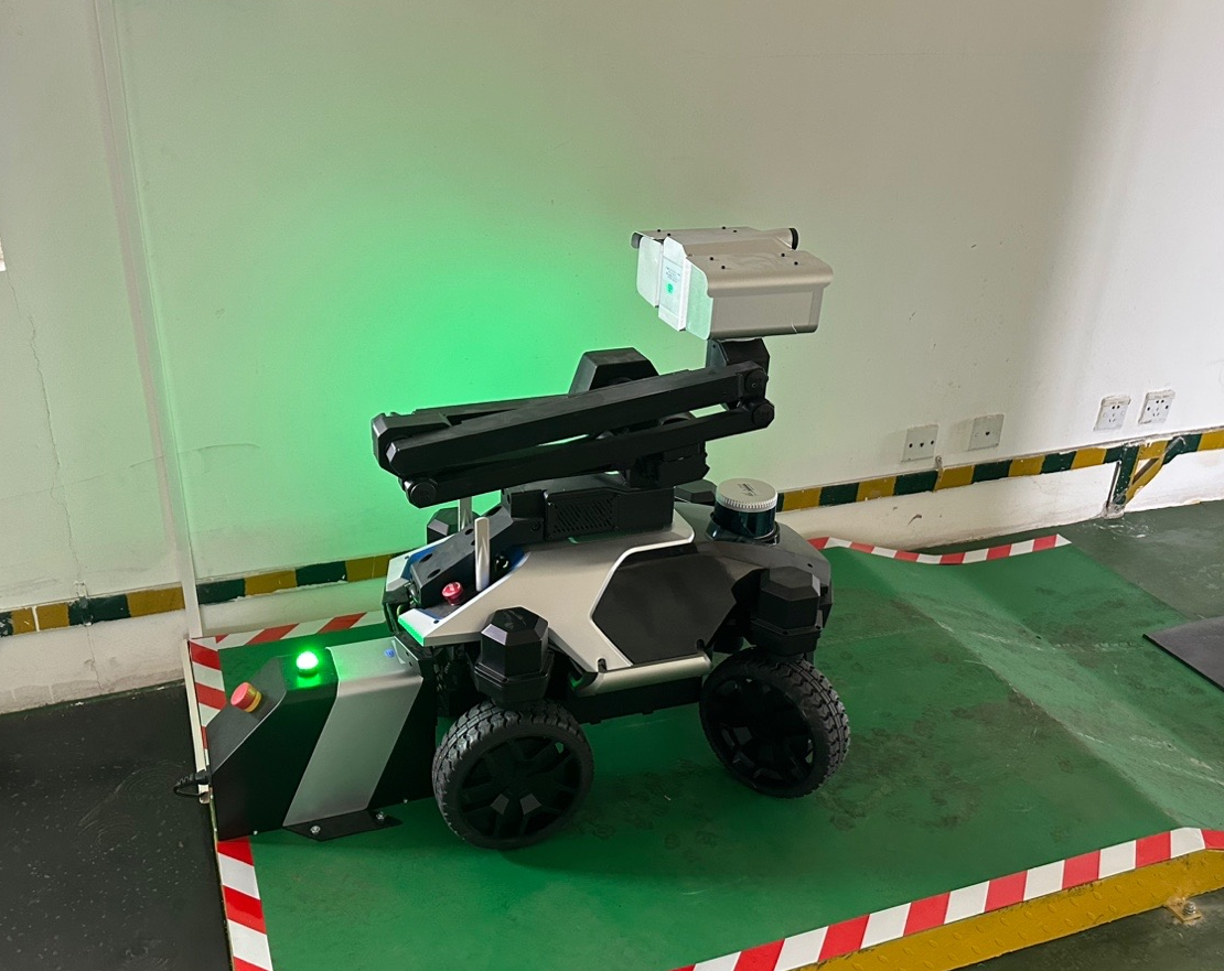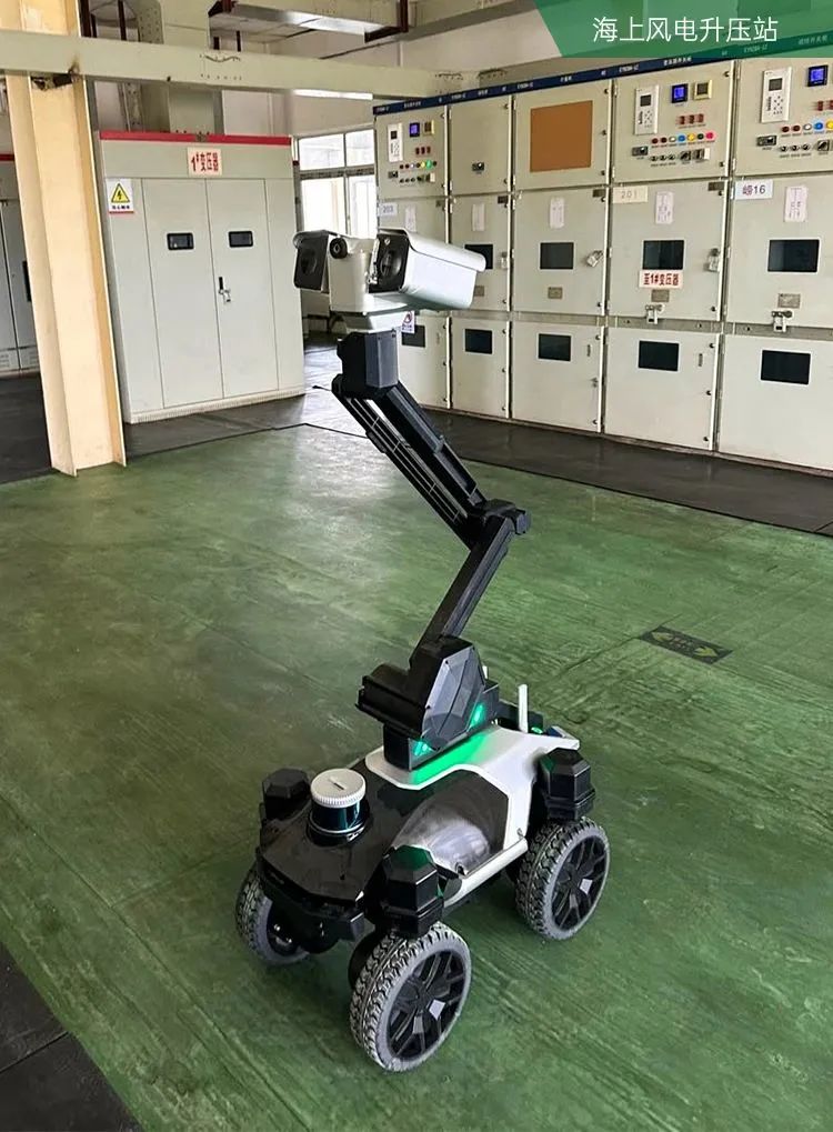 这台智能轮式升降臂巡检机器人名叫T7-S,由天创机器人自主研发生产,以5台移动机器人组合协同作业方式,针对海上升压站区域内电力设备运行情况、表计开关状态等进行监测识别,发现设备异常或缺陷,实时发出报警。实现巡检高频化、可视化、预警化的智能检测监测的全自主运维模式。