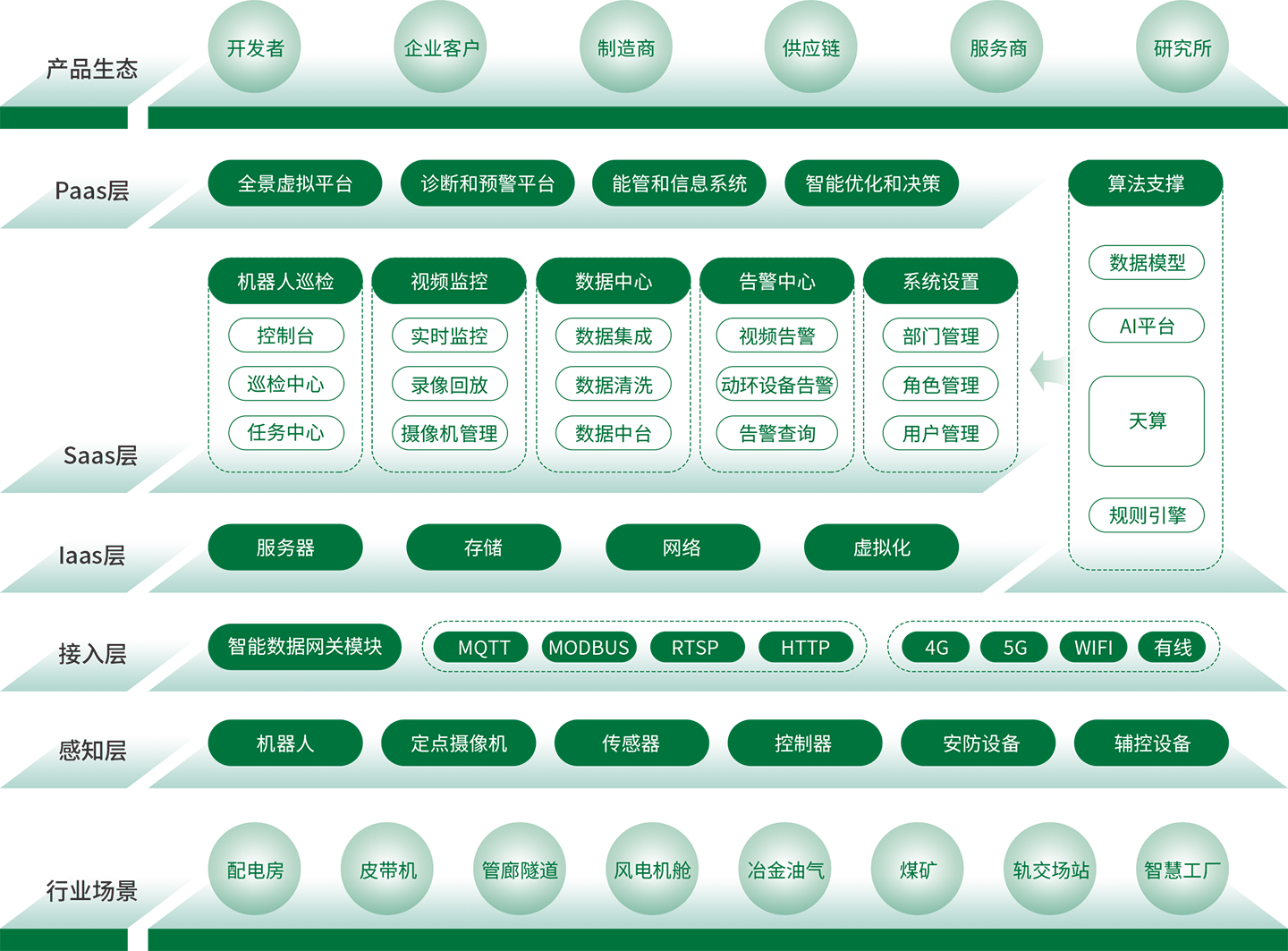 面向巡检机器人及智能运维应用的天创T-One场景级工业互联网平台,能够通过标准化协议连接巡检机器人、传感器、摄像头、安防设备、辅控设备等工业硬件,并提供面向各行业的如SCADA、DCS、PMS等系统健全的数据互联接口,具备快速打通设备物联与多层控制网络的能力,从而实现工业运维平台项目的快速落地交付。